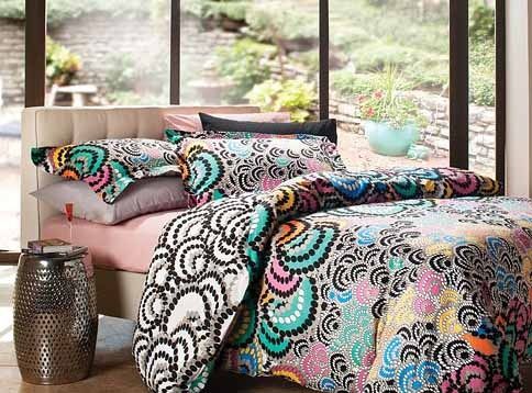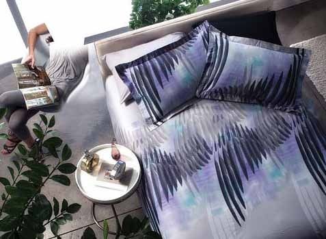 以黑色羽毛為設(shè)計(jì)元素,少許的藍(lán)色和紫色,點(diǎn)綴在銀灰的底色上,色與色之間相互映襯融合,讓款式簡(jiǎn)潔的床品有著豐富的層次與漸變。如潑墨般大氣的圖紋,隨性而不乏精致神韻。