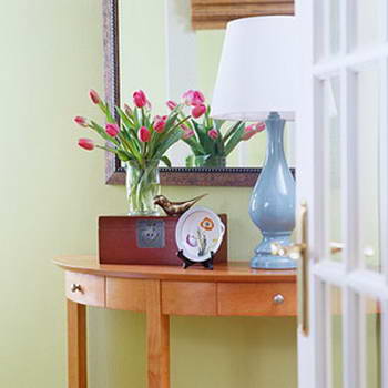 綠色是一個很自然的特色色彩,在色輪上介于黃色和藍色之間。這走廊就在起居室的外邊,為過渡到陽光般的黃色的客廳提供了一個舒緩的地帶(在起居室中,靠枕和一個新的裝飾椅子也增加了綠色) 。配件如手繪的箱子和塑像,靈感建立于花園的亞洲風格的椅墩。 |