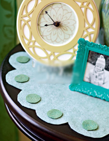 毛氈制成的桌墊可以保護桌面,再剪些扇形花邊和波點會更加俏皮。和桌墊搭配的座鐘也是由相框改裝成的,拆掉相框的玻璃罩和底板,按照底板的尺寸剪裁。在紙板上墊上紙,在中央打洞安裝座鐘裝置。把座鐘重新安回相框后,再用小托架墊起來。