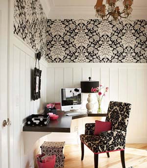 大面積的空間留白,搭配小范圍的花朵圖案壁紙,通過(guò)圖案的變化來(lái)裝飾墻壁。如果你不希望工作室里太過(guò)花哨,可以選用黑白的素色調(diào)花案讓空間的視覺感變得更加豐富。