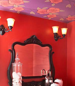 在天花板上運(yùn)用艷麗的大花朵圖案,紅色和紫色的濃烈搭配,以及絢爛的玫瑰花圖案都同時(shí)增加了衛(wèi)浴間里的浪漫感覺。