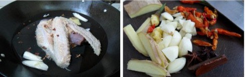 3、熱鍋下少許油倒入鴨塊炒干水份、加入佐料、鹽炒出香味;