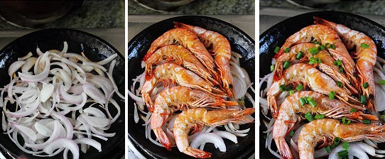4、另起一灶,取一個鐵板,放在火上燒熱幾分鐘,倒入少許油,放上洋蔥絲,瞬間洋蔥的香味被激出,關(guān)火將剛煎好的蝦放在洋蔥絲上,撒少許青蔥點綴即可。