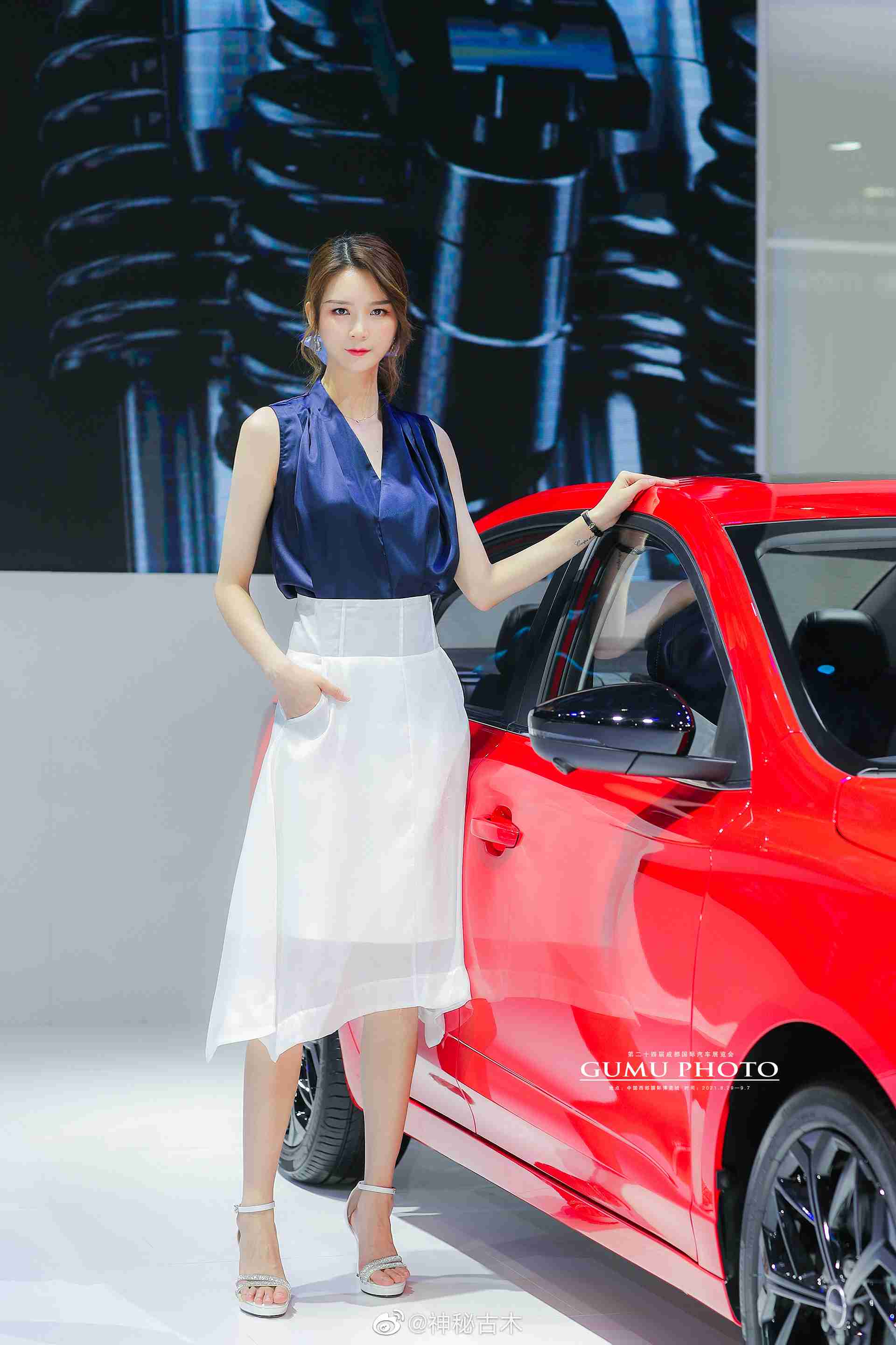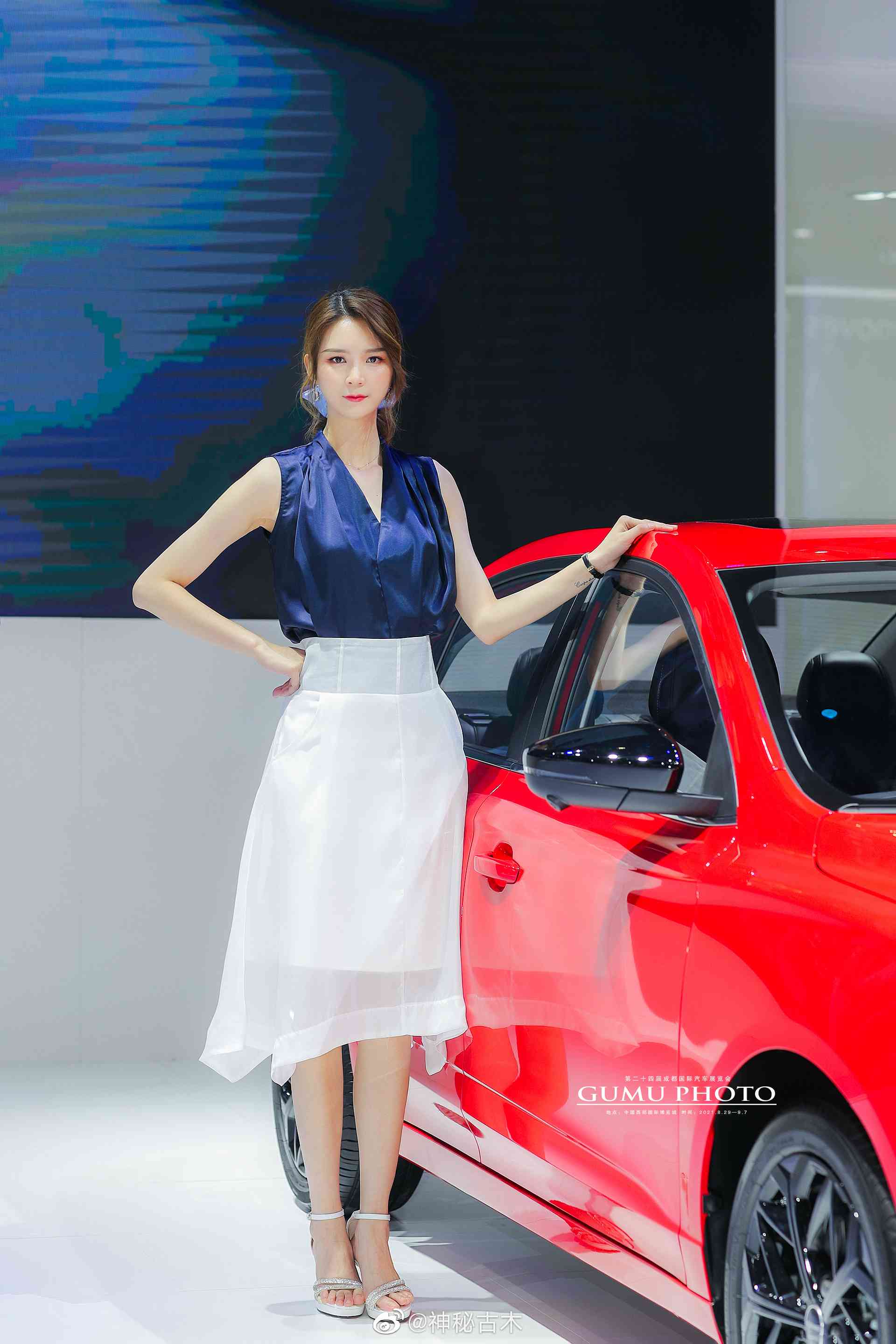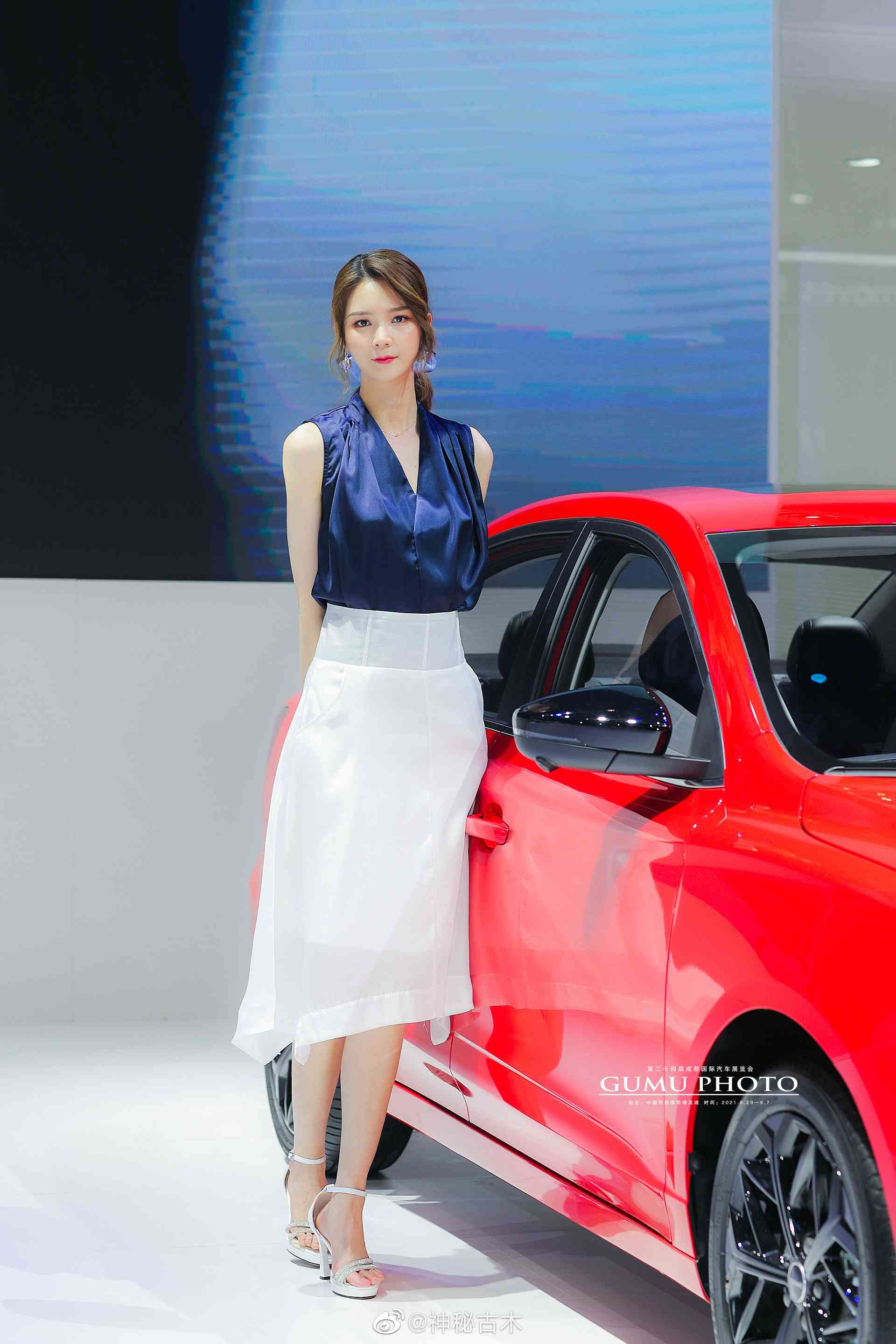 笑得很甜的吊帶短裙美女紅色跑車車模香肩美腿私拍