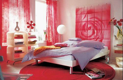 如果僅僅用紅色的窗簾和床頭背景墻來搭配紫色的床品,那么房間中淺色的木地板便會顯得顏色過淺,從而讓空間失去平衡感,所以這張圓形的大紅色地毯不僅僅是為了浪漫而鋪設(shè)的。