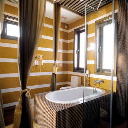 如今洗浴已經(jīng)是一種生活方式,尤其泡澡時注重周圍環(huán)境的氛圍,通常衛(wèi)生間里的環(huán)境都是冷硬的浴具和磚墻,為了讓洗浴時心情更加愉悅,不妨在浴缸周圍垂下紗質(zhì)帷幔,在若隱若現(xiàn)中營造浪漫氛圍,而平時不使用時,也可以用精選的窗簾流蘇墜系扎起來,則又是另一番情調(diào)。