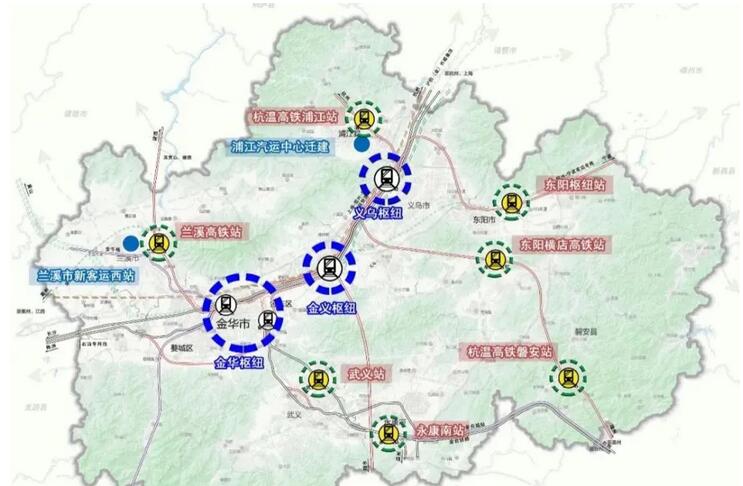1、門戶型樞紐: 高鐵義烏站客運(yùn)樞紐(在建項(xiàng)目):“十四五”期間續(xù)建完工高架站房改造,站房面積 75000 平方米,結(jié)合金甬鐵路、杭溫高鐵,設(shè)置越線站模式。 金義綜合交通客運(yùn)樞紐(計(jì)劃開工項(xiàng)目):高架站房,站房面積30000平方米。高鐵金義站站場(chǎng)規(guī)模近期3臺(tái)7線,遠(yuǎn)期4臺(tái)10線,預(yù)留磁浮磁懸浮高鐵接入條件。依托金義東軌道、金義三四線、杭麗高鐵、金華至紹興至寧波客運(yùn)專線、滬杭(金)廣磁懸浮和金義國(guó)際機(jī)場(chǎng)(義烏機(jī)場(chǎng)遷建)等重大項(xiàng)目,打造集高鐵、軌道、城市客運(yùn)等多種方式為一體的綜合交通樞紐。 2、地區(qū)型綜合客運(yùn)樞紐 東陽橫店高鐵綜合客運(yùn)樞紐(計(jì)劃開工項(xiàng)目):高架站房,站房面積30000平方米,南市街道槐堂村附近,目前匯集了杭溫高鐵與金義東軌道。 蘭溪高鐵站綜合樞紐(計(jì)劃開工項(xiàng)目):“十四五”期間完工側(cè)式站房新建工程,站房面積 10000平方米,規(guī)劃范圍西北側(cè)沿 S314 省道,東臨黃大仙赤松園,南至凱旋路。規(guī)劃建設(shè)成蘭溪市旅游發(fā)展服務(wù)中心,配套旅游服務(wù)中心、休閑度假、文化體驗(yàn)等項(xiàng)目,串聯(lián)蘭溪主要游線,形成一核引領(lǐng),全域發(fā)展的旅游產(chǎn)業(yè)發(fā)展格局。 浦江高鐵站(計(jì)劃開工項(xiàng)目):“十四五”期間完工側(cè)式站房新建工程,站房面積 15000 平方米。主要建設(shè)內(nèi)容包括:建設(shè)長(zhǎng) 1890 米,寬 48 米南起巖鄭路,北至 G351互通的站前大道一條;建設(shè)站前廣場(chǎng),進(jìn)出站連接道路及落客平臺(tái)匝道,地下停車場(chǎng)(人防工程),出租車和社會(huì)車輛地上停車場(chǎng),公交站場(chǎng)、游客中心及配套用房等工程。 杭溫高鐵磐安站(計(jì)劃開工項(xiàng)目):總建筑面積 7500 平方米,建有客貨運(yùn)站房、信號(hào)樓、配電房、派出所等用房以及應(yīng)急箱涵、站前大道、橋梁等配套設(shè)施,其中站房 4000 平方米。開通鐵路,對(duì)推進(jìn)磐安經(jīng)濟(jì)發(fā)展,方便居民出行,意義極其重大。 3、一般型綜合客運(yùn)樞紐 金甬鐵路東陽樞紐站(計(jì)劃開工項(xiàng)目):結(jié)合金甬鐵路完工側(cè)式站房新建工程,站房面積 5000 平方米,位于江北街道石宅村附近,將作為東陽國(guó)際物流園中轉(zhuǎn)站,義甬舟大通道重要節(jié)點(diǎn)。 貨運(yùn)樞紐重點(diǎn)規(guī)劃建設(shè)項(xiàng)目 到2025年,形成“三區(qū)六園”的總體布局,綜合貨運(yùn)樞紐55個(gè)