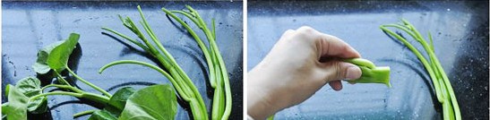 原料:空心菜梗、朝天椒、蒜、豆豉、豬油、茶油、鹽、雞精。 做法: 1、買來的空心菜,洗衣凈后,葉、梗分開剔除,粗圓的梗莖順手捏扁(用刀拍扁也行),這樣利于空心菜梗入味;