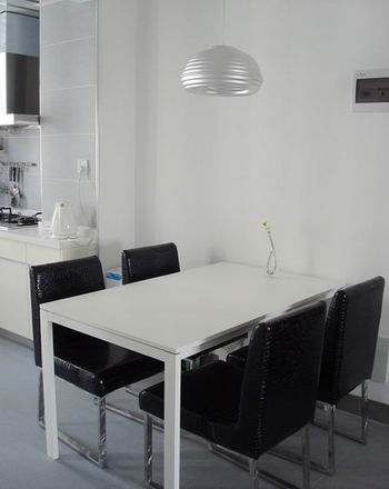 灰色調(diào)中性家 進門向左便是飯廳,方正的餐桌很省空間。我們注意到餐椅的腳是金屬質(zhì)地的,所以房主用了耐磨的灰色仿古磚,而且全屋的瓷磚基本上都是同一種的磚,只是大小規(guī)格有區(qū)別。餐廳一旁我們能看到開放式廚房,免去的廚房門也是省了不少資金。
