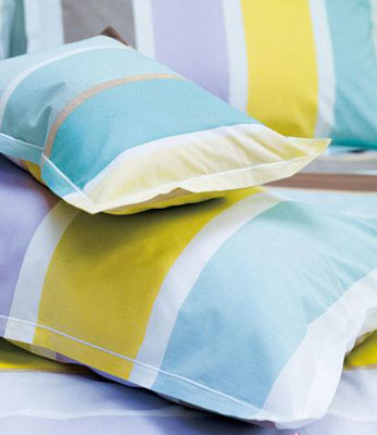 床品細(xì)節(jié):床品采用了彩色織布工藝,裝飾條紋明快大方,色澤清透而具表現(xiàn)力。淡紫調(diào)的條紋中配合有清淡的水藍(lán)色、黃綠色等顏色,增添了清爽的感覺(jué)。枕套與被套采用了同樣的主題?空碡Q向的紋理排列打破了大面積橫條的單調(diào)感,加強(qiáng)了空間的韻律。