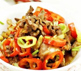原料: 豬心1個、青紅椒各2個、鹽2克、生抽5克、陳醋5克、白糖3克、蠔油5克、水淀粉適量、辣椒面一大匙、蒜蓉少許。 做法: 1、豬心買回,洗凈血塊,切成十字花刀,用清中浸泡半個小時,清水中滴入些許高度白酒。如出血水后倒掉,重新?lián)Q水,再浸泡; 2、除辣椒面和蒜蓉外的配料調(diào)成一碗醬汁,備用; 3、將豬心從清水中撈出,瀝干。鍋里倒入油5克,燒熱,放入蒜蓉煸香,將瀝干水的豬心倒入鍋內(nèi)快手翻炒一分鐘,加入一勺辣椒面,翻炒一分鐘。倒入調(diào)好的醬汁,繼續(xù)大火燜兩分鐘,最后倒入切好的青紅椒至熟即可。