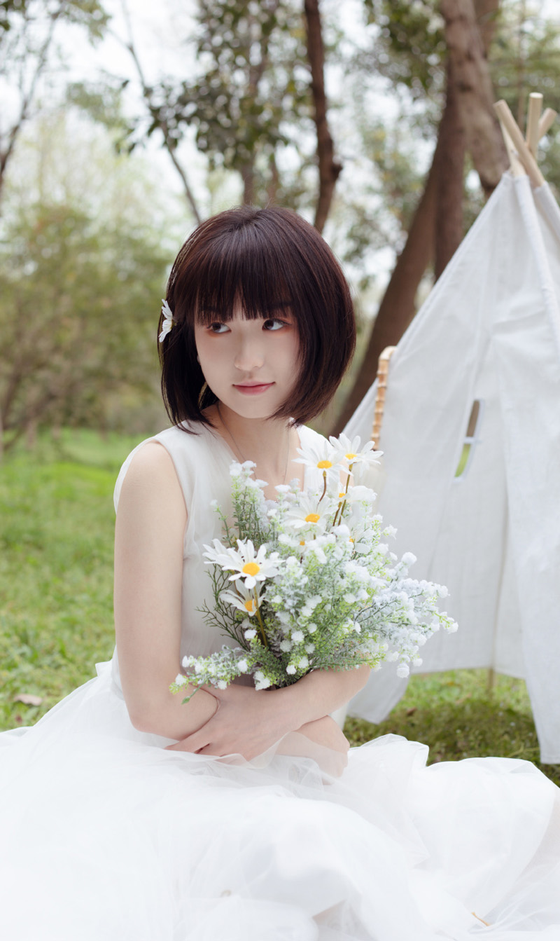 純白紗裙齊耳短發(fā)白嫩肌膚清純美女戶外