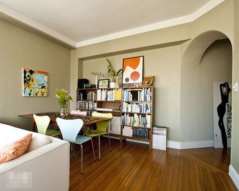 客廳沙發(fā)后的這一小塊區(qū)域,是個多功能區(qū)域。簡易的書架上擺放了許多主人的書籍。這里可用作書房,還可臨時充當餐廳。