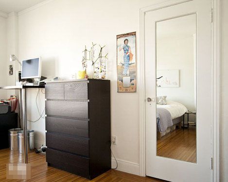 門上安裝了一面大鏡子,延伸了房間的空間感。門邊的具有老上海味道的海報,成為這間溫馨的臥室里一個有趣的亮點。
