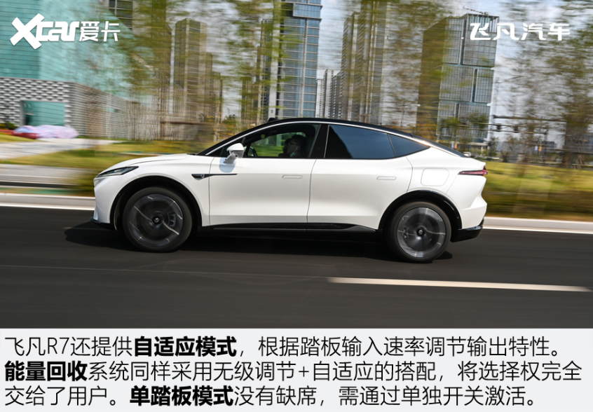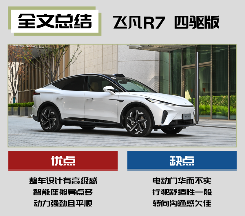 轎跑設(shè)計是否影響了空間表現(xiàn)?答案是影響有限。前/后排頭部空間非常寬敞,即便放在所有SUV中,也是極為出色的一類。即便戴著禮帽,頭部空間也完全夠用。論空間布置和人機(jī)模型,飛凡R7恐怕可以給“蔚小理”上一課。 駕乘 | 硬朗為主線 飛凡R7提供兩種動力方案,分別為單電機(jī)后驅(qū)和雙電機(jī)四驅(qū)。試駕車搭載雙電機(jī)四驅(qū)系統(tǒng),其綜合最大功率達(dá)到了400kW(544馬力)。論動力強弱,電動車從來沒輸過。人們更關(guān)心的是,電動車能否像燃油車那樣好開。飛凡R7的思路是:把選擇權(quán)交給用戶。
