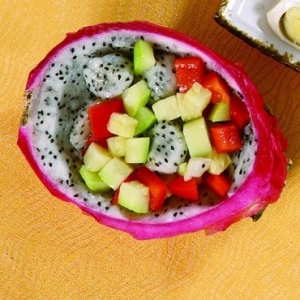 三鮮火龍果 用料:火龍果1/2個、鮮貝2個、西葫蘆50克、彩椒50克、鹽1克 制作步驟 1、火龍果洗凈,將果肉挖出,皮留下來做盛具;西葫蘆洗凈,去皮,切成小丁;彩椒洗凈后切丁。 2、鍋置火上,倒入適量油。油熱后, ...
