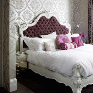 粉紅色或紫色被用作今天的主角。一個華麗的法國風(fēng)格的床(下圖)使臥室迷人。設(shè)計師Guild 設(shè)計的大型印刷金屬壁紙為房間增加閃光點(diǎn)。