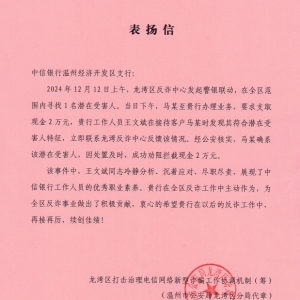 近日,中信銀行溫州人民路支行收到了一封來自客戶胡大媽的表揚(yáng)信,信中對工作人員業(yè)務(wù)熟練、耐心細(xì)致、樂于助人的服務(wù)精神表示了高度的認(rèn)可和感謝。這份表揚(yáng)信是對中信銀行溫州分行金融服務(wù)工作極大的肯定和鼓勵(lì)。銀 ...