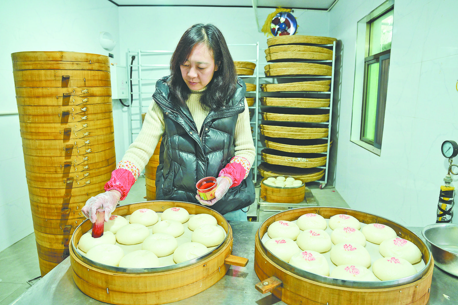 1月11日,上溪鎮(zhèn)荷市村上品饅頭店店主正在給剛出籠的饅頭蓋上紅色福字,隨后將快速發(fā)往上海。隨著新春佳節(jié)臨近,用傳統(tǒng)技藝制作的吳店饅頭深受顧客歡迎,遠(yuǎn)銷北上廣等地。