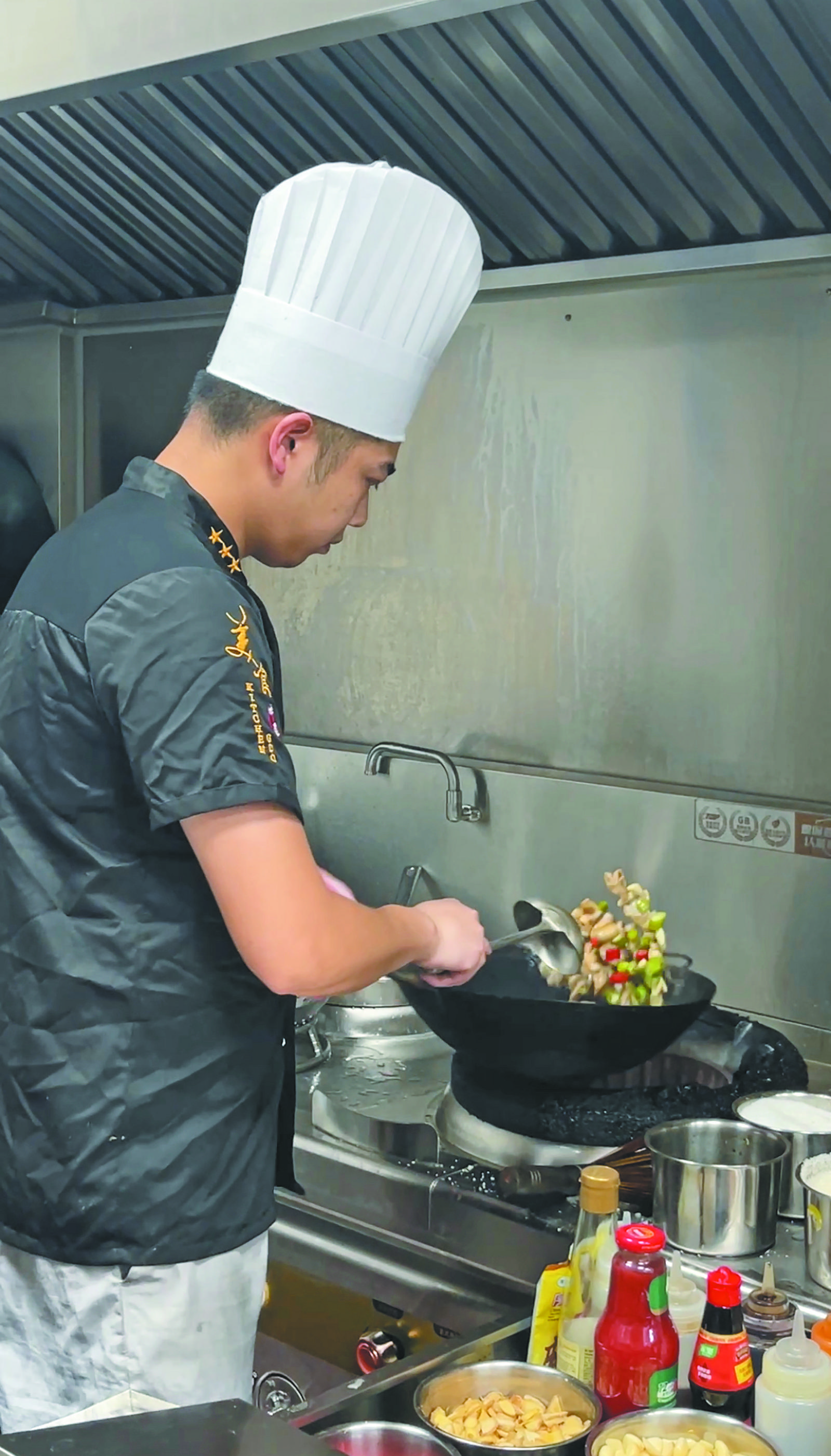 高溫天氣,有這么一群人雖然不必在室外接受“烤”驗(yàn),但要面對另一個(gè)同樣甚至更加酷熱的“戰(zhàn)場”——餐館的后廚。此次鏡頭的主角是廚師,也是高溫下堅(jiān)韌的奮斗者之一。8月21日,記者成為大廚們的“徒弟”,體驗(yàn)他們的工作環(huán)境,記錄他們?nèi)绾卧诟邷睾陀蜔熤,烹制出美味的家常菜?/p> 當(dāng)天上午9點(diǎn),我來到位于江東街道龔大塘小區(qū)的一家義烏土菜館,還未走進(jìn)廚房,便聽到里面?zhèn)鱽硪魂嚸β档穆曧。走近一看,?5后”廚師倪福亮和他的伙伴們身著整潔、干爽的工作服,頭戴工作帽,在各自的崗位上有條不紊地忙碌著。不經(jīng)意間,我發(fā)現(xiàn)后廚入口的一側(cè)桌子上,放著一盒藿香正氣水。“每天開工前,我們一人喝一瓶,防止中暑。”倪師傅說。 約1小時(shí)后,雖然用餐高峰未到,但是后廚已經(jīng)進(jìn)入“戰(zhàn)斗”狀態(tài),現(xiàn)場鍋鏟翻飛,廚師們揮舞鏟勺,食材在高溫下歡快地“跳躍”。盡管墻上的鼓風(fēng)機(jī)奮力“工作”,廚房的溫度依然不斷攀升。用餐高峰來臨,灶臺區(qū)域的溫度已經(jīng)超過50℃,鐵鍋表面溫度一度達(dá)到120℃。 倪師傅站在灶臺旁,正在制作義烏特色土菜“干菜炒大腸”。只見大鐵鍋里,滾燙的菜油翻滾著,豬大腸被倒入鍋中時(shí),灶臺區(qū)的體感溫度更高了。中餐尤其是土菜,就認(rèn)一個(gè)“鍋氣”。這股氣看不見摸不著,卻藏在爆炒的大腸里,需要鍋夠熱、火夠猛。食材下鍋發(fā)出“滋啦滋啦”聲響,瞬間鎖住水分和香味。 在炒菜中,最考驗(yàn)功力的是“拋鍋”環(huán)節(jié)。干鍋包菜是我向倪師傅學(xué)習(xí)烹制的首道家常菜。站在灶臺前,我有些緊張,害怕顛不起鐵鍋,更擔(dān)心自己被旺盛的爐火燙傷。果不其然,我的左手緊緊握住鐵鍋把柄,咬緊牙關(guān),想顛起鐵鍋里的包菜,連試幾次,鍋里的包菜仍舊沒有動靜。“你用兩只手一起試試!蹦邘煾翟谝慌怨膭钗摇5上У氖,最后還是以失敗告終。倪師傅接過鐵鍋和鍋鏟,憑借臂力,拋起7斤重的鐵鍋,包菜在空中劃出完美的弧線,鍋抬起來的那一刻,火苗高高躥起,火光映紅了他的臉龐。顛鍋是廚師的“基本功”之一,他們往往會通過顛鍋?zhàn)屽伬锩娴氖巢膩砘胤,盡可能讓美味佳肴受熱更均勻,調(diào)料及時(shí)入味。 干鍋包菜還沒出鍋,我的額頭開始冒汗,幾滴汗水滑落下來,流進(jìn)眼睛里!袄背鲅蹨I,不要用手揉,用水沖洗或者用毛巾擦!蹦邘煾堤嵝盐。臨近下午1點(diǎn),倪師傅的臉上掛著汗水,摘下廚師帽后,頭發(fā)也濕了。走到冰箱前,他拿出一大瓶冰水,快速喝了幾口!斑@種時(shí)候要及時(shí)擦汗,不要猛吹空調(diào),一冷一熱容易感冒。”倪師傅說。 別看倪師傅是位“95后”,但從業(yè)已經(jīng)12年了。他說,多熱也要掌握好火候,再熱也要守好這口鍋,讓顧客吃得痛快。倪師傅的父親也是一位廚師,父子兩代人腳踏實(shí)地、勤懇耐勞,廚藝也越來越好。在煙火升騰的方寸之間,廚師烹飪出食客喜歡的飯菜。 一座城市的“煙火氣”往往藏在夏天里。“天熱家里就不想開火,下館子吃,感受義烏的煙火氣!辈宛^的老客說,閑時(shí)約上三五好友,卸下疲憊品味美食,感受藏在城市深處的那股滾燙的煙火氣。 |
