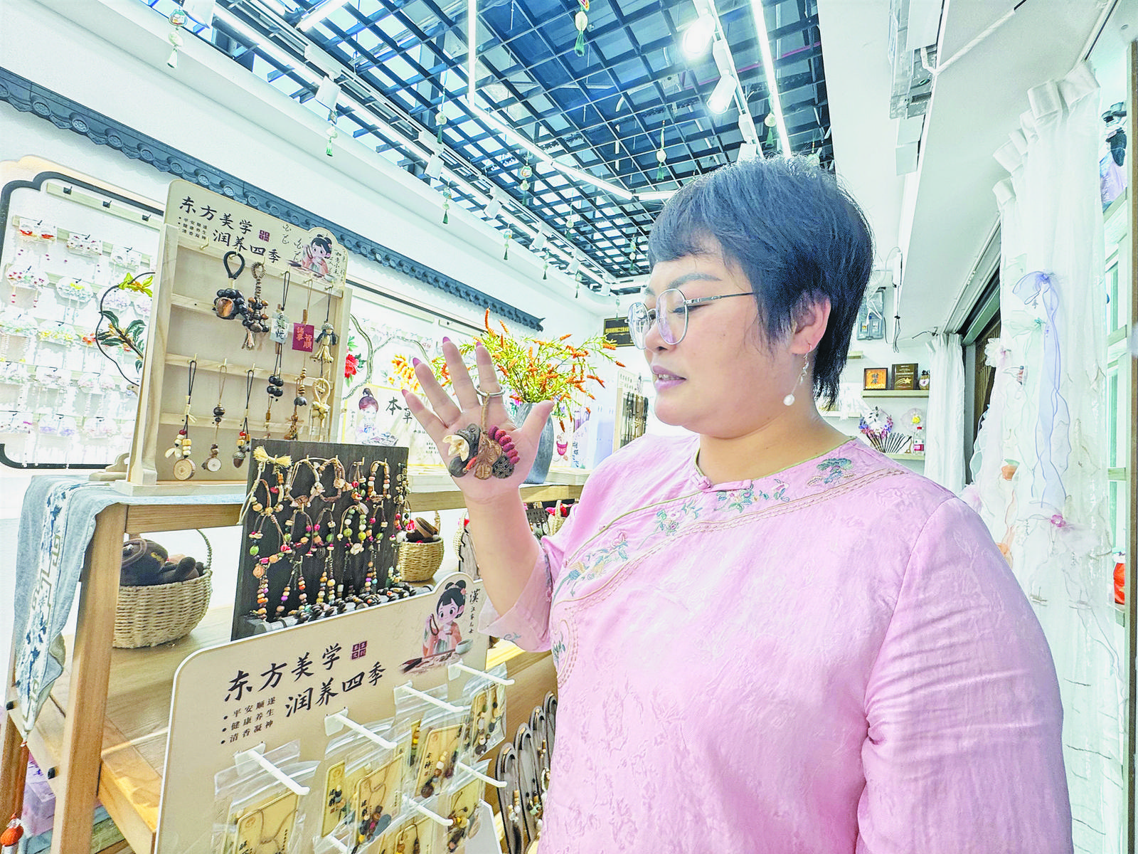 “這個(gè)是黃芪,這個(gè)是蒲公英,還會(huì)配小藥罐……”近日,記者走進(jìn)位于國(guó)際商貿(mào)城一區(qū)的漢家兒女國(guó)風(fēng)非遺手作店鋪,店鋪負(fù)責(zé)人王紫鑰手捧一個(gè)個(gè)精致的中藥材掛件,笑著介紹說(shuō),這是新近推出的中藥系列產(chǎn)品“開個(gè)方子”。置身于店內(nèi),淡淡的中藥清香沁人心脾。放眼望去,耳飾、手串、掛件等各類飾品琳瑯滿目,它們以中藥材為核心元素,并巧妙融入水晶等配飾,別具一格。 在今年的一次展會(huì)中,王紫鑰偶然接觸到了國(guó)家級(jí)非遺項(xiàng)目合香珠,已深耕非遺領(lǐng)域多年的她,頓時(shí)萌生了新的靈感:能否將中藥文化與現(xiàn)代飾品相結(jié)合,拓寬其使用場(chǎng)景,讓傳統(tǒng)草本以更輕盈、更時(shí)尚的方式走進(jìn)日常生活,讓文化傳承變得更親切、更有趣? “把中藥原材料轉(zhuǎn)化為日常配飾。”基于這一想法,今年3月,王紫鑰便開始了新的嘗試。她帶著團(tuán)隊(duì)前往藥材市場(chǎng),精心挑選色澤、形狀符合要求的中藥材,并依據(jù)其屬性進(jìn)行分類處理。從藥材的篩選、打孔到穿串,所有步驟均堅(jiān)持純手工制作,雖然進(jìn)度緩慢,卻保證了每一件產(chǎn)品的獨(dú)特與精致。 每一款中藥飾品不僅是一件配飾,更被賦予了美好的寓意與情感寄托。王紫鑰隨手拿起一個(gè)鑰匙扣介紹道:“比如這一款,它融合了紅棗、蓮子、松果等八味中藥材,寓意‘碩果累累’,既傳遞出豐收的喜悅,也寄托著對(duì)美好生活的祝愿。” “漢家兒女”系列新品一經(jīng)推出便廣受好評(píng),迅速掀起搶購(gòu)熱潮。“目前產(chǎn)品供不應(yīng)求,銷售速度遠(yuǎn)超生產(chǎn)進(jìn)度。”王紫鑰告訴記者,現(xiàn)在下單也需等待一個(gè)月才能發(fā)貨。與此同時(shí),中藥系列產(chǎn)品吸引了全國(guó)各地博物館的關(guān)注,還有多家連鎖店慕名前來(lái)尋求合作。 如今,越來(lái)越多的顧客在逛市場(chǎng)時(shí),都會(huì)被中藥飾品獨(dú)特的設(shè)計(jì)吸引進(jìn)店!拔視(huì)向他們?cè)敿?xì)介紹產(chǎn)品的成分與其背后的文化屬性,大家都覺(jué)得非常新奇!蓖踝翔說(shuō)道。更令人驚喜的是,這些融合了中國(guó)傳統(tǒng)元素的飾品還成功吸引了來(lái)自新加坡、美國(guó)等海外客戶的關(guān)注,讓這些蘊(yùn)含東方智慧的飾品得以漂洋過(guò)海,走入更多國(guó)際消費(fèi)者的視野。 記者了解到,目前店內(nèi)的中藥系列產(chǎn)品已有1000多款,每日還會(huì)上新30余種設(shè)計(jì)。不斷擴(kuò)大的產(chǎn)品線,延續(xù)了傳統(tǒng)中藥文化的生命力,更為其發(fā)揚(yáng)光大開辟出新的路徑。為了更好地融合中藥文化與現(xiàn)代設(shè)計(jì),王紫鑰特地學(xué)習(xí)了中藥相關(guān)課程。“我希望以中藥飾品為載體,讓更多人在日常佩戴中認(rèn)識(shí)中藥材、感受中藥文化的魅力,從而推動(dòng)文化傳播和認(rèn)同。”她說(shuō)道。日后,“漢家兒女”還計(jì)劃推出中藥主題擺件、團(tuán)扇等更多元的產(chǎn)品形態(tài),不斷探索非遺手作與東方生活美學(xué)的結(jié)合。 |