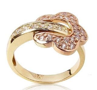 金色和紅色兩種顏色相搭配組成的新娘婚戒,小顆粒鉆石鑲嵌的花朵形狀戒托與金色的戒環(huán)緊緊的圍繞扣在一起,款式設(shè)計很具有時尚的優(yōu)雅感,讓新娘的指間也綻放著迷人的優(yōu)雅色彩,金色戒環(huán)的小顆粒鉆石也將這款新娘戒指變的具有閃耀的光茫。