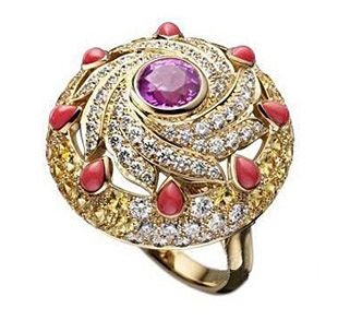 這款新娘戒指具有奢華的高貴氣質(zhì),以金黃色為主調(diào),圍繞著戒環(huán)所鑲嵌的紅色橢圓寶石將整個戒指的高貴感完全的提升,黃色的鉆石與銀色的鉆石相互鑲嵌搭配,中間的圓紫色顆粒鉆石是這款新娘婚戒的點(diǎn)睛之筆,將新娘的指間變的更加具有高貴的奢華感。
