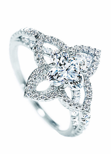 推薦理由:花瓣密鉆,鉆石更大更閃耀。 Louis Vuitton Les Ardentes Ring 切割:明亮切割 設(shè)計(jì)亮點(diǎn):戒托由5克鉑金打造,1顆介于1至1.25克拉的中心渾圓或尖細(xì)形Monogram花朵圖案LV Cut美鉆鑲嵌,110顆明亮式切割鉆石圍繞,總重0.53克拉。