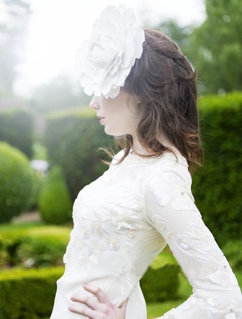 長度剛剛到鎖骨、微微帶點(diǎn)卷度的中發(fā)很適合氣質(zhì)偏向端莊、成熟的女孩,只是有時(shí)會(huì)顯得有些沉悶,而體積夸張的花朵性發(fā)飾,恰好可以打破這種沉悶感,讓平日里普通的微卷中發(fā)也能變身漂亮的新娘發(fā)型,將花朵發(fā)飾戴在靠近額頭的頭頂一側(cè),好像出席正式場合時(shí)佩戴的小巧禮帽,幫你打造出貴族淑女般的新娘造型。