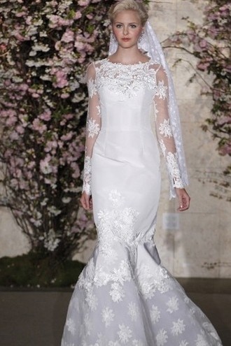 魚尾形設計的婚紗,領口和裙擺鋪滿繡花,腰身處平滑一體的設計,很好地展現(xiàn)出新娘柔美的腰身。