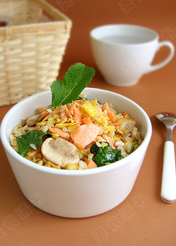 原料: 白飯300克三文魚150克,雞蛋一個青豆15克,胡蘿卜粒15克,玉米粒15克,蔥花20克, XO醬20克 鹽3克 胡椒粉1克 料酒10ml 雞粉2克 香油少許 油適量 做法: 1.將三文魚切丁,用鹽,胡椒粉和料酒腌5分鐘。 2.雞蛋打成蛋液,放一半進鍋里炒至半熟,備用。 3.熱油鍋,將三文魚以大火快炒過油后,撈出瀝干油分。 4.鍋中重新放油,爆香XO醬; 5.下白飯入做法4.的鍋中,炒至飯松散,加入青豆,胡蘿卜粒 |