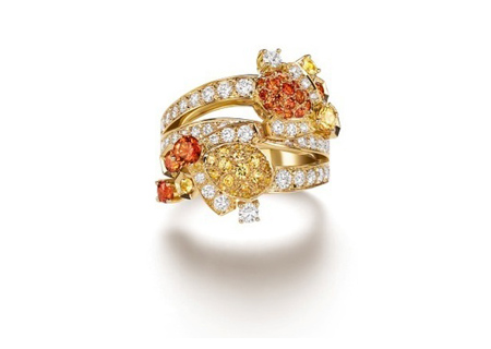 蜜糖般的黃色與橙色藍(lán)寶石,以鉆石加以點(diǎn)綴,配上女皇般的黃金蜜蜂珠寶,盡顯華貴。