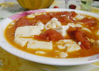 原料: 豆腐250克,西紅柿100克,香菇10克,蔥,姜,鹽,糖,花椒水,淀粉,味精適量,油15克,高湯200毫升。 做法: 豆腐切成長5厘米、寬3厘米、厚1.5厘米的塊,入沸水燙過撈出,瀝凈水。香菇切片,蔥姜切末。炒鍋上火,燒熱加油,放蔥、姜炒香,放香菇翻炒,隨后加入西紅柿、白糖、鹽、花椒水、高湯,開鍋放入豆腐塊燜燒約3分鐘,待湯少用淀粉勾芡,放味精出鍋即可。 |