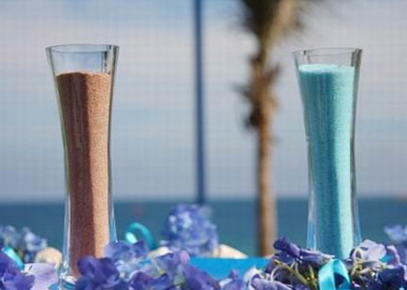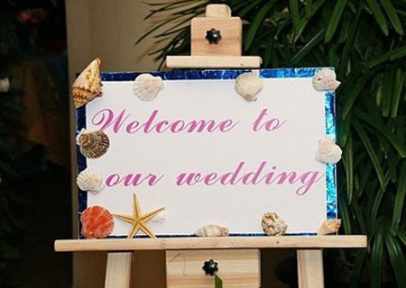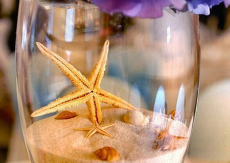 大?偸亲屓松裢煤Q蟮乃{(lán)色來裝點(diǎn)自己的婚禮,別致而富有情趣。世間贊美海的文章和詩句很多,可見大海是多么為人們所喜愛。人說大海是神秘的,讓我們把海洋世界搬到桌面,讓可愛的海星、貝殼、海螺、海馬、細(xì)沙……也來見證你們的愛情吧!