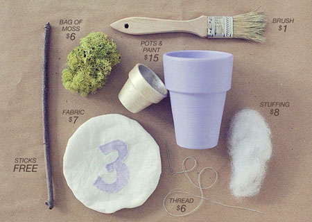 所需材料:棒子、烘干的苔蘚、面料、盆、油漆、縫紉機、針和線、畫筆、牛皮紙和棉花。