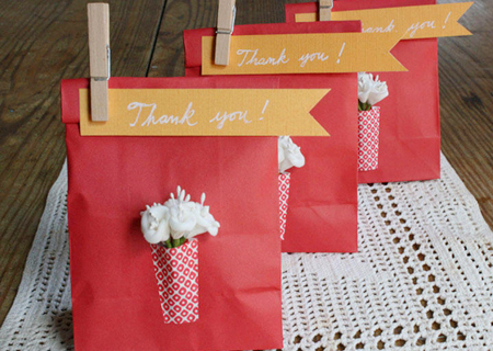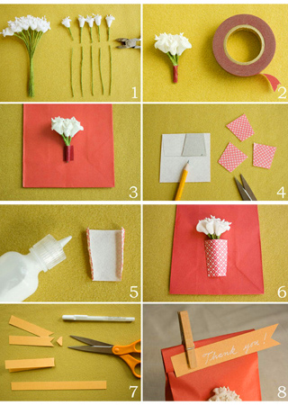 材料:鉗子、小型人造花卉、膠帶、紅色的包裝紙(也可挑選喜歡的圖案)、白膠、純色卡片、白色的中性筆、微型衣夾