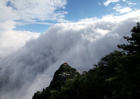 在天池亭觀晚霞和云景,更是別有奇趣,有時云霧彌漫,游者背陽而立,偶而可見云霧屏幕上出現(xiàn)圍繞人形的彩色光環(huán),稱為“寶光”,俗稱“佛光”。有時云海翻騰,可見東南山峰云流如瀑的“瀑布云”。