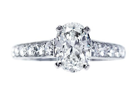 一直以來,卵形鉆戒指備用矚目,湯姆克魯斯就用一顆這樣的華麗戒指套在了凱蒂赫爾姆斯的手上。卵形鉆因為刻面多而折射著耀眼的光芒,所以它也更討女人的喜愛。一克拉的橢圓形切割鉆石,鉑金指環(huán)。