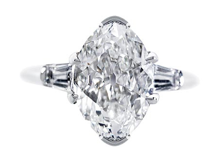 這一稱(chēng)呼來(lái)自18世紀(jì)的凡爾賽宮,朝臣把佩戴這一戒指做為身份的象征和劃分。橄欖形明亮型鉆石的這種形狀可以使鉆石的克拉重量達(dá)到最佳,給鉆石一個(gè)比較大的外表。這種花式明亮型鉆配有圓形或者水滴明亮型的副石,看起來(lái)則更加的漂亮。這款戒指也可以讓橄欖型縱向佩戴,如維多利亞和貝克漢姆的婚戒,也可以橫向,如凱瑟琳澤塔-瓊斯的婚戒。3.3克拉橄欖型切割鉆石,鉑金指環(huán)。 |