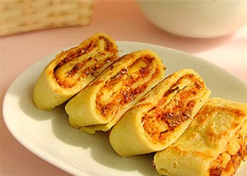 6.待蛋液即將凝固時,將蛋餅卷起,煎成金黃色出鍋切成段即可。