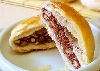 材料: 低粉200克、白砂糖40克、水100克左右、黃油40克。 做法: 1.將面粉過篩,分別把兩種面和好,放在一邊松弛半個小時左右。 2.利用面團松弛的時間我們來處理紅豆餡,將提前泡過一晚的紅豆放入鍋中,加入適量的清水,開火煮豆子,將紅豆煮至酥爛,沒有湯汁了,就可以關(guān)火了。紅豆因為已經(jīng)浸泡了一晚,所以非常好熟,煮不了多久豆子就會裂開,達到我們需要的效果了。在煮好的紅豆中加入適量白糖,并用勺子不斷的攪拌,碾壓,不要全部搗爛,保留一些豆子,這樣吃起來口感最好。這樣紅豆餡就算做好了。 3.下面做油皮包油酥,也就是紅豆餅皮的做法。將醒過的油皮,油酥分別搓成長條,并分成10段。 4.取一塊油皮,搟平,包入油酥,封口捏緊,避免油酥漏出來。這步做好后醒3-5分鐘。 5.用手掌將面團壓平,再用搟面杖搟成長條狀,再將它卷起。這步做好后再醒3-5分鐘。 6.再用手掌壓平,搟成長條,再卷起,再醒3-5分鐘。然后將這個醒好的小面團搟成圓面皮就可以了。 7.最后包入紅豆餡,做成小餅的形狀。 8.在小餅表面刷蛋黃水2次,放入預(yù)熱200度的烤箱,烤約20-30分鐘,表面呈金黃色即可。