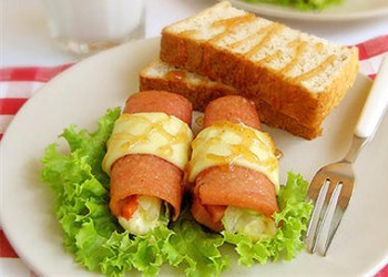 材料:火腿4片、胡蘿卜35克、圓白菜35克、洋蔥35克、蘆筍、蘑菇等等你喜歡的蔬菜各需35克、 奶酪片或奶酪絲適量 鹽、白胡椒粉適量。 1.需要的材料和準備工作:火腿切片,蔬菜切粗絲,奶酪片折疊一下再切成條。 2.處理蔬菜絲:將除了洋蔥之外的蔬菜汆水,加入兩勺鹽在滾水中,取出瀝干水。放入大容器中,加入鹽胡椒粉攪拌。 3.做火腿卷:將火腿攤平,放上拌好的蔬菜,再放上奶酪條順勢卷起,并用牙簽固定。 做好的火腿卷可以用平底鍋稍稍加熱,至里面的奶酪融化為即可。還可以用微波爐加熱,喜歡奶酪多的可以再火腿片上再蓋上一片。做成焗烤的,只需將火腿卷并排放入烤箱,再在上面均勻的撒上奶酪絲,放入預熱200度的烤箱,烘烤約六分鐘,直至奶酪融化成金黃色即可。