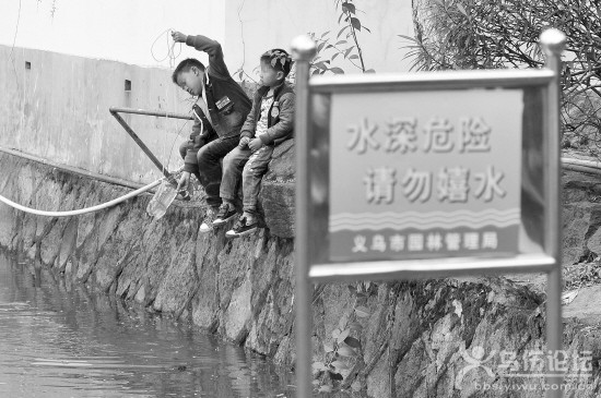 昨天,記者在義烏駱賓王公園看到,湖邊立著“水深危險、請勿嬉水”的告示牌,但兩個小男孩坐在湖岸玩水,希望家長看管好自己的孩子!