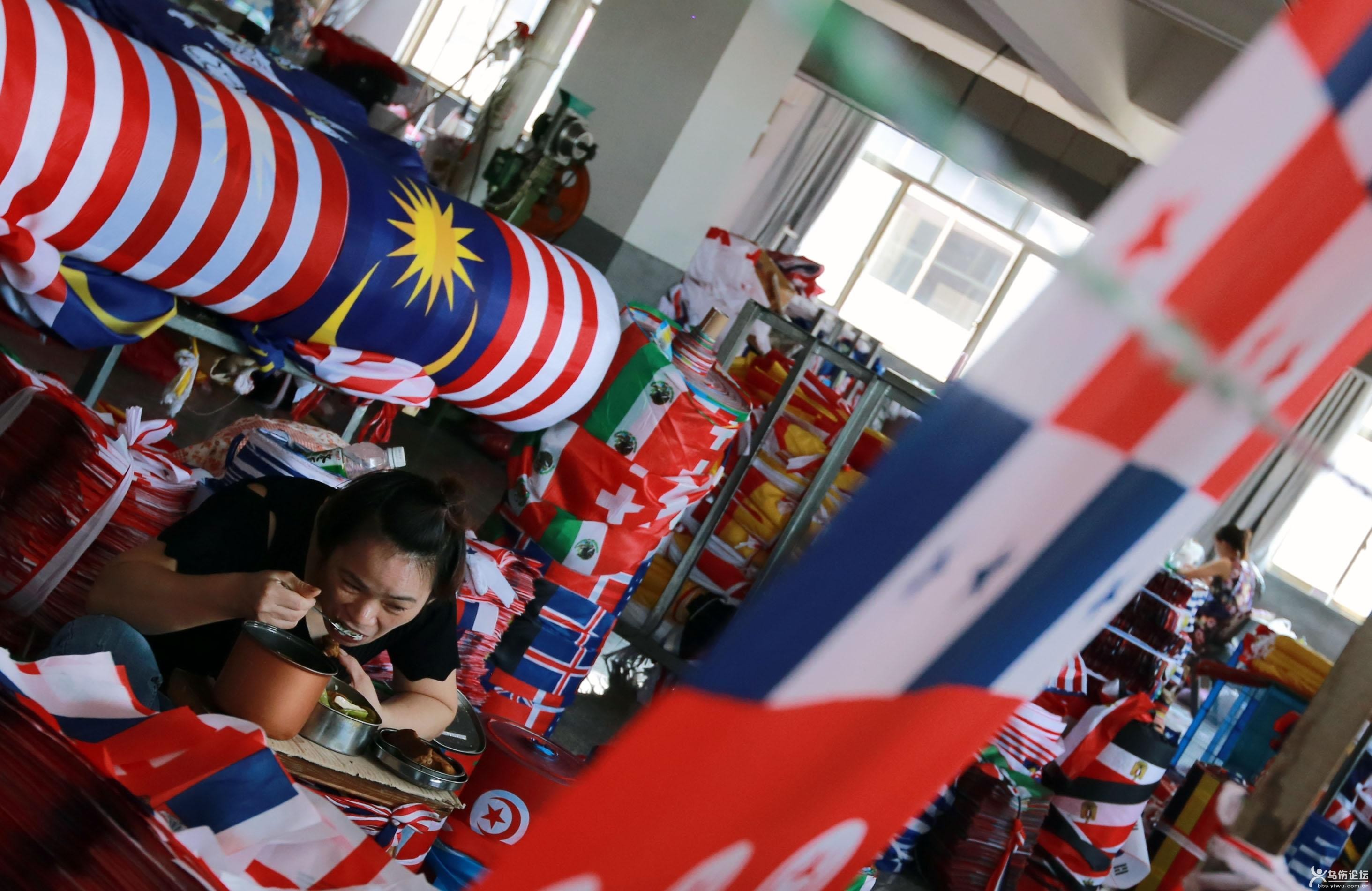 世界杯開戰(zhàn)前1個月,義烏商販們也正在加班加點(diǎn)趕工制作為球隊(duì)加油助威的小國旗,員工甚至忙到連吃飯都安排在車間。