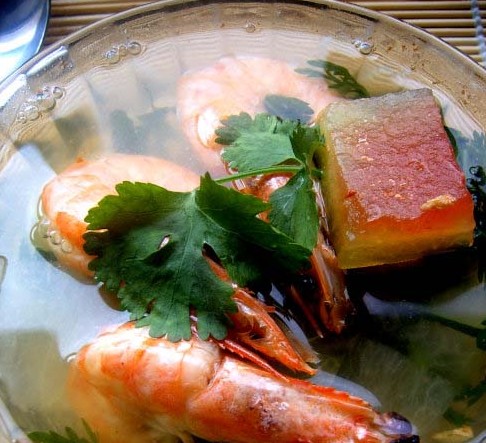 原料: 蝦3只、茼蒿葉1小把、冬瓜(不去皮)、西瓜皮、生姜粒、鹽、胡椒粉 準(zhǔn)備工作: 減去蝦腳蝦須,切背挑蝦線,洗凈。冬瓜西瓜皮切片,茼蒿葉洗凈稍切(不宜太碎)。 做法: 將材料放進(jìn)小鍋里,注入沒過材料的涼水,上火燉煮,20分鐘調(diào)入適量鹽、胡椒粉即可。 |