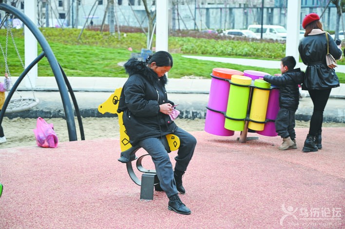 在兒童游樂區(qū),記者看到,秋千、花朵爬架、平衡器、地形滑梯等游樂設(shè)施上人頭攢動(dòng),但定睛一看,不少空位被成人“霸占”,他們或坐在秋千上玩手機(jī),或騎在搖搖椅上發(fā)呆,有幾個(gè)小朋友繞了一圈甚至找不到空閑的游樂設(shè)施。