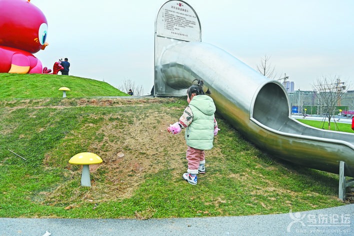 在兒童公園的地標(biāo)“金烏雕塑”旁,設(shè)置著幾個(gè)順著山坡蜿蜒而下的滑梯,孩子們順著滑梯下至坡底后,不少家長(zhǎng)帶著孩子直接從緊挨滑梯的草坡爬回起點(diǎn),來來回回?cái)?shù)次。記者看到,游人攀爬行經(jīng)的區(qū)域,草皮磨損嚴(yán) 重,部分區(qū)域黃土裸露,十分不美觀。
