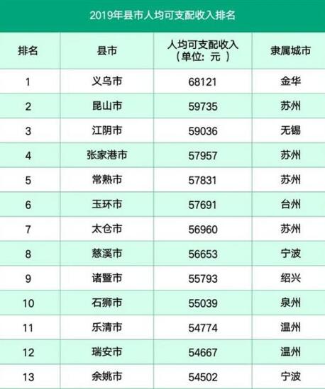 日前,全國各縣(縣級市)2019年人均可支配收入20強縣市新鮮出爐,義烏排第一。