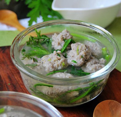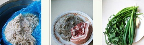原料:面條魚、花肉、茼蒿、蛋清、小蔥、姜。
