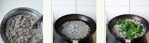 4、鍋內(nèi)下熱水(適量添加高湯),用小勺把調(diào)好味的魚餡依次挖入水中;